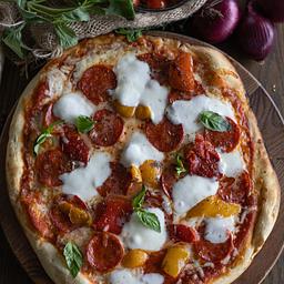 Thin Crust, Double Italian Pepperoni, Roast Red Pepper & Buffalo Mozzarella topped with basil Ask for Chilli Oil/Flakes for Extra Bang